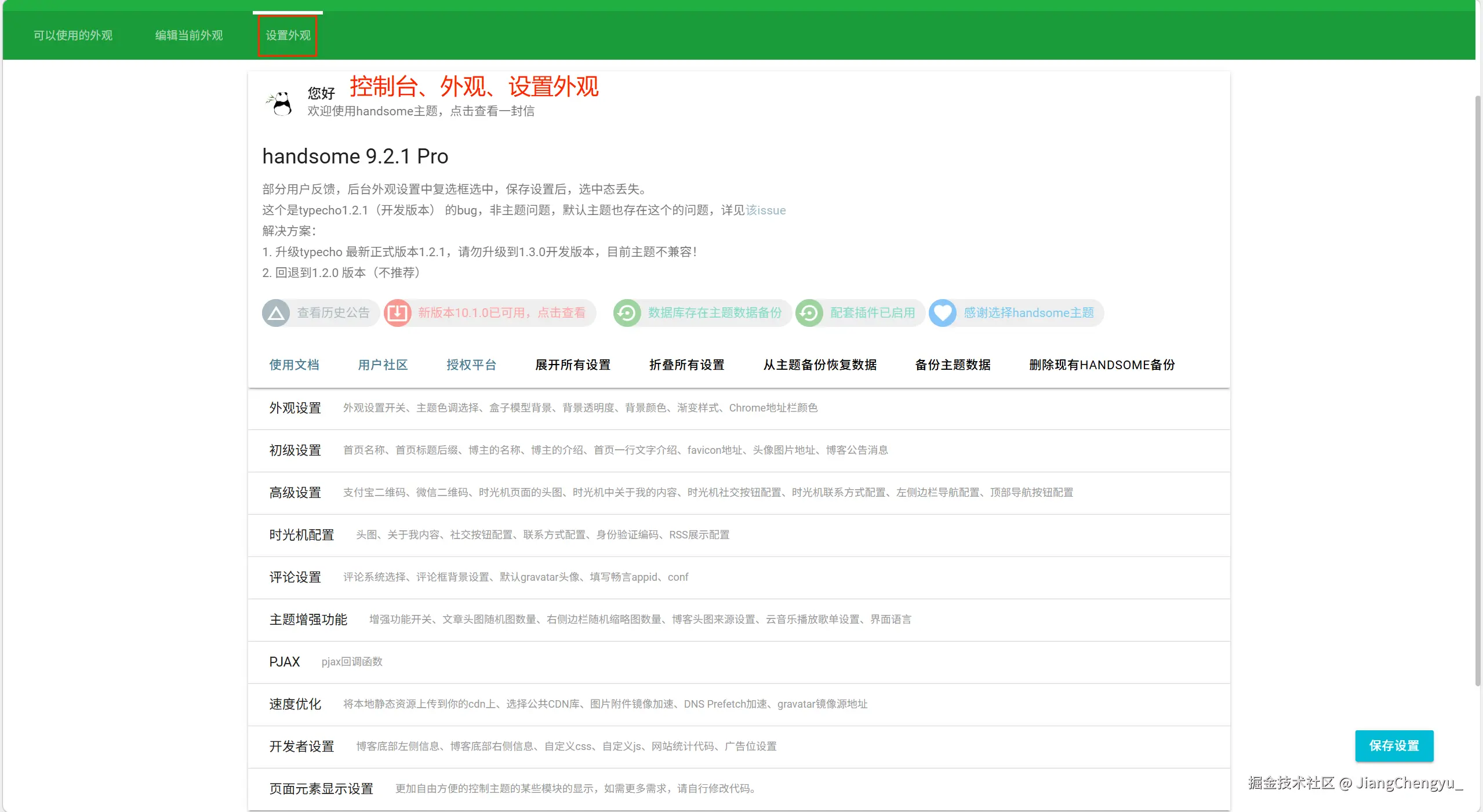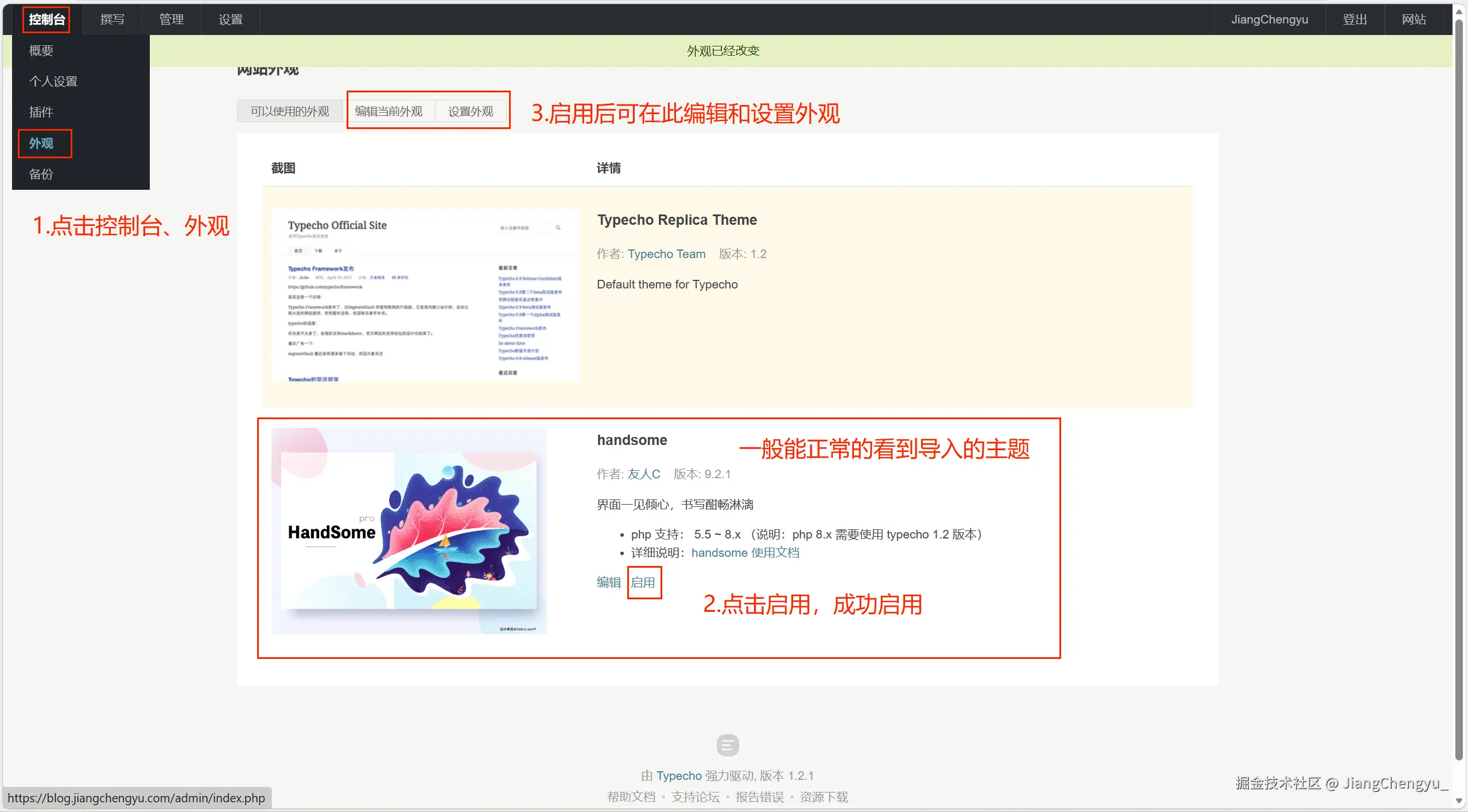 至此完成了Typecho的扩展。我们可以多探索探索扩展后的后台,尤其是设置外观。我使用的handsome主题,通过设置外观,让网站表现出各种各样的外观,也更容易的找到自己喜欢的风格。