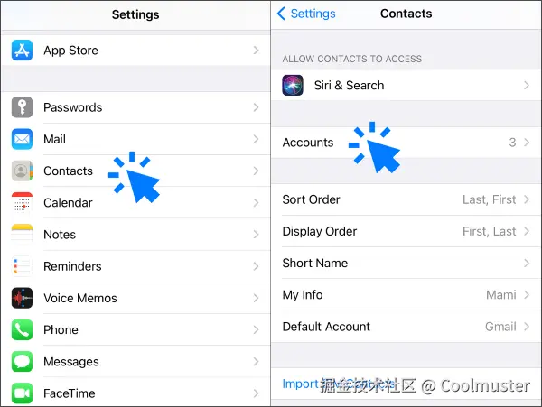 步骤1.启动iPhone的“设置”应用,然后导航到“联系人”部分。点击“帐户”选项,然后选择一个Gmail帐户。