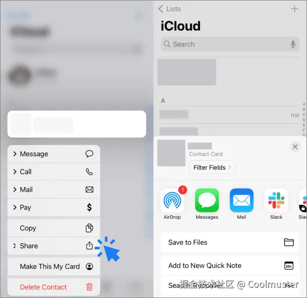 步骤2. 点击“分享联系人”按钮,选择电子邮件作为分享方式。