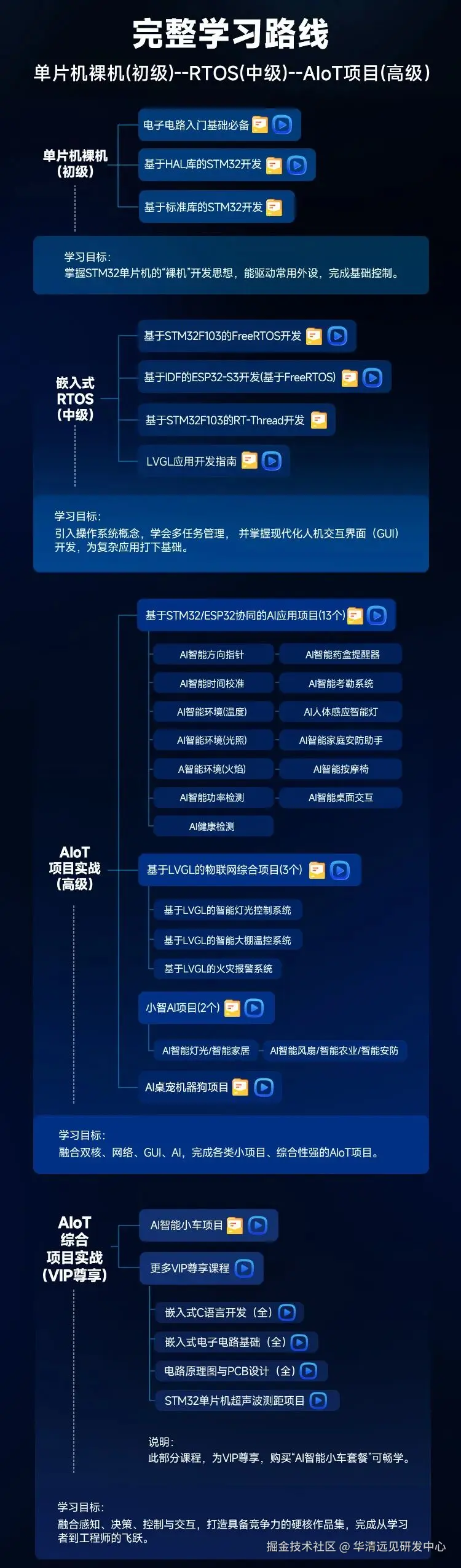 STM32 与 ESP32 是单片机入门经典 MCU,技术普及度、生态完整性和商业应用优势显著。STM32 擅长精准控制,是工业与教育首选;ESP32 及升级版 S3 主打物联网,集成联网与 AI 能力,广泛应用于 AIoT 终端。二者高度互补,所以我们提倡 “双核学习路径”,从入门到综合项目实战 ,建议先通过 STM32 夯实通用 MCU 开发基础,再用 ESP32 拓展物联网等开发能力,掌握后可提升技术广度与就业竞争力,实现 1+1>2,这也是双核心开发板的教学设计初衷。