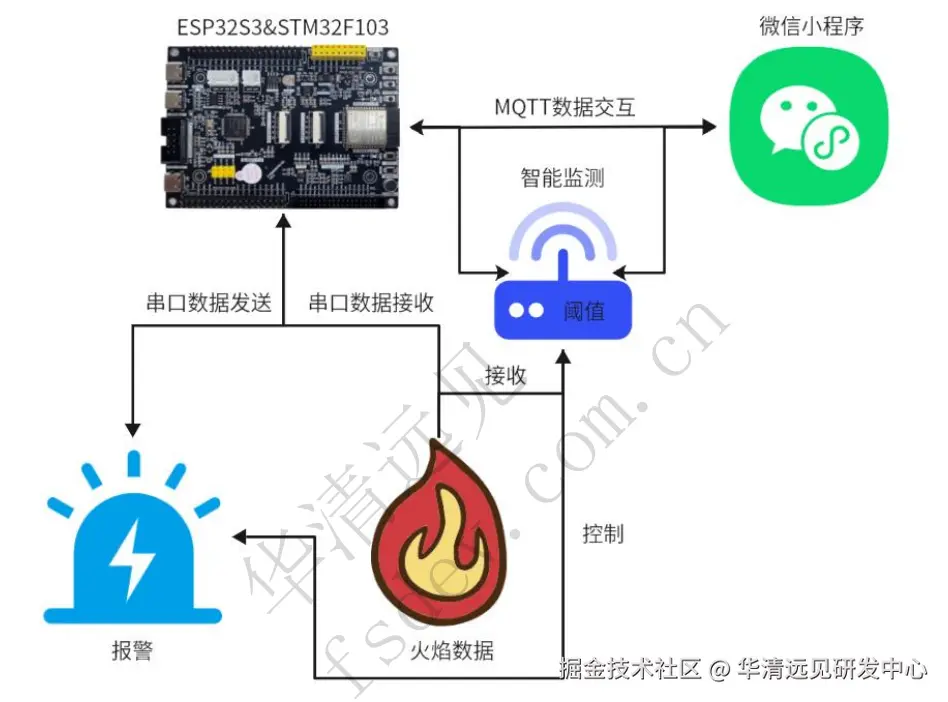 该项目由ESP32S3和STM32F103配合完成,下层由STM32F103来驱动火焰与蜂鸣器传感器,ESP32S3通过LVGL可视化界面操控设备,上层由微信小程序可远程控制设备,通过串口+MQTT协议实现整个项目,既可手动控制设备,也可以通过智能控制来自动操控蜂鸣器状态。