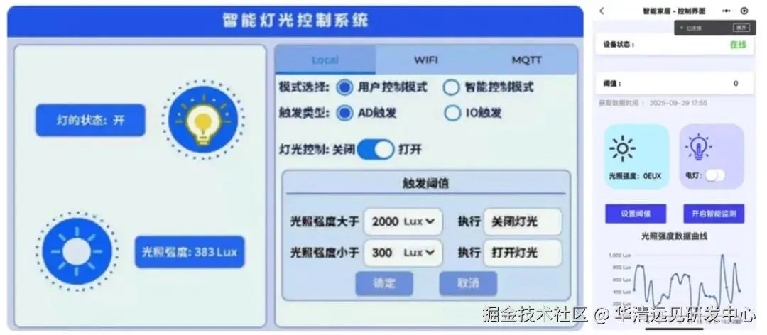 - 代码中固定阈值,再通过LVGL界面开启智能模式,即可实现依据光照强度来决定灯的开关;