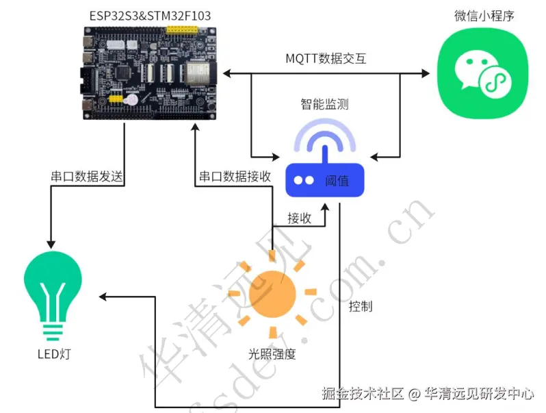 通过 MQTT 和应用端进行数据交互,发布光照强度、LED 状态和智能监测,接收微信小程序控制指令和阈值设置