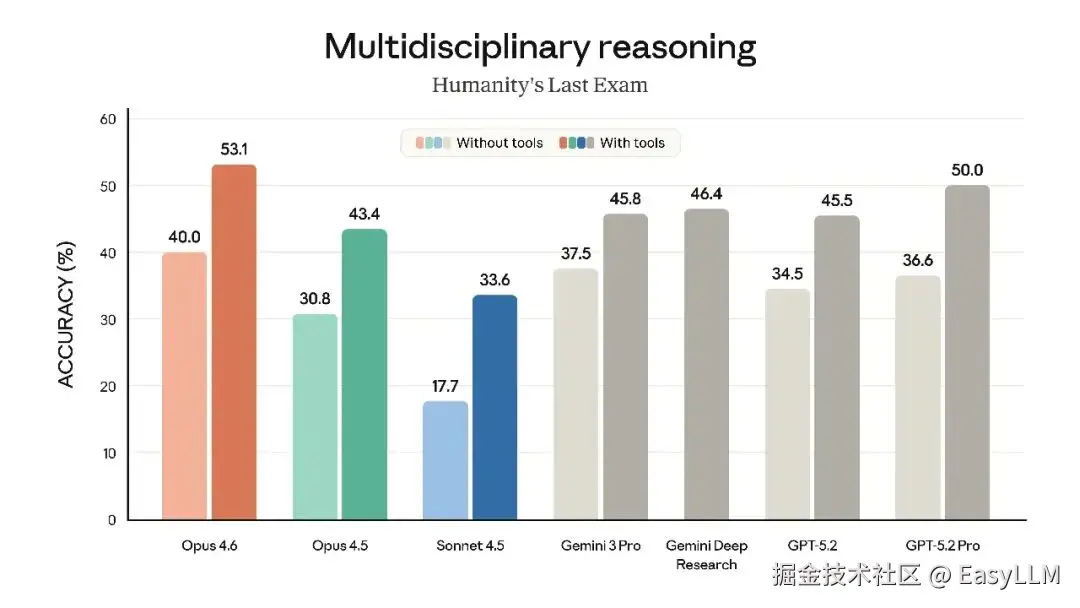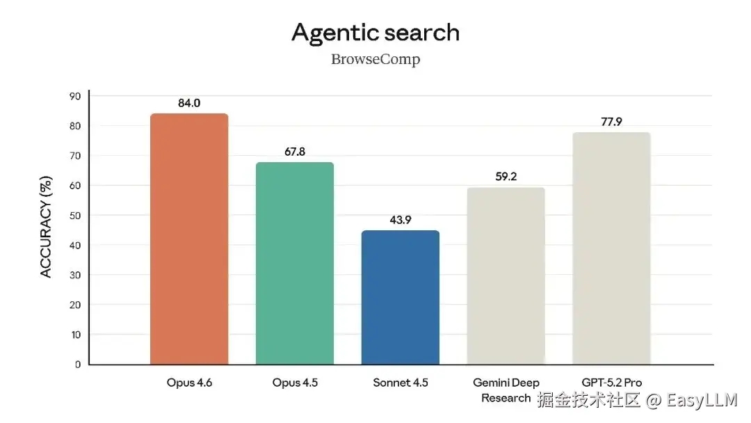 在Humanity's Last Exam(复杂多学科推理测试)中,Opus 4.6领先所有其他前沿模型。在BrowseComp(评估模型定位网络难查信息的能力)上也取得了最佳表现。