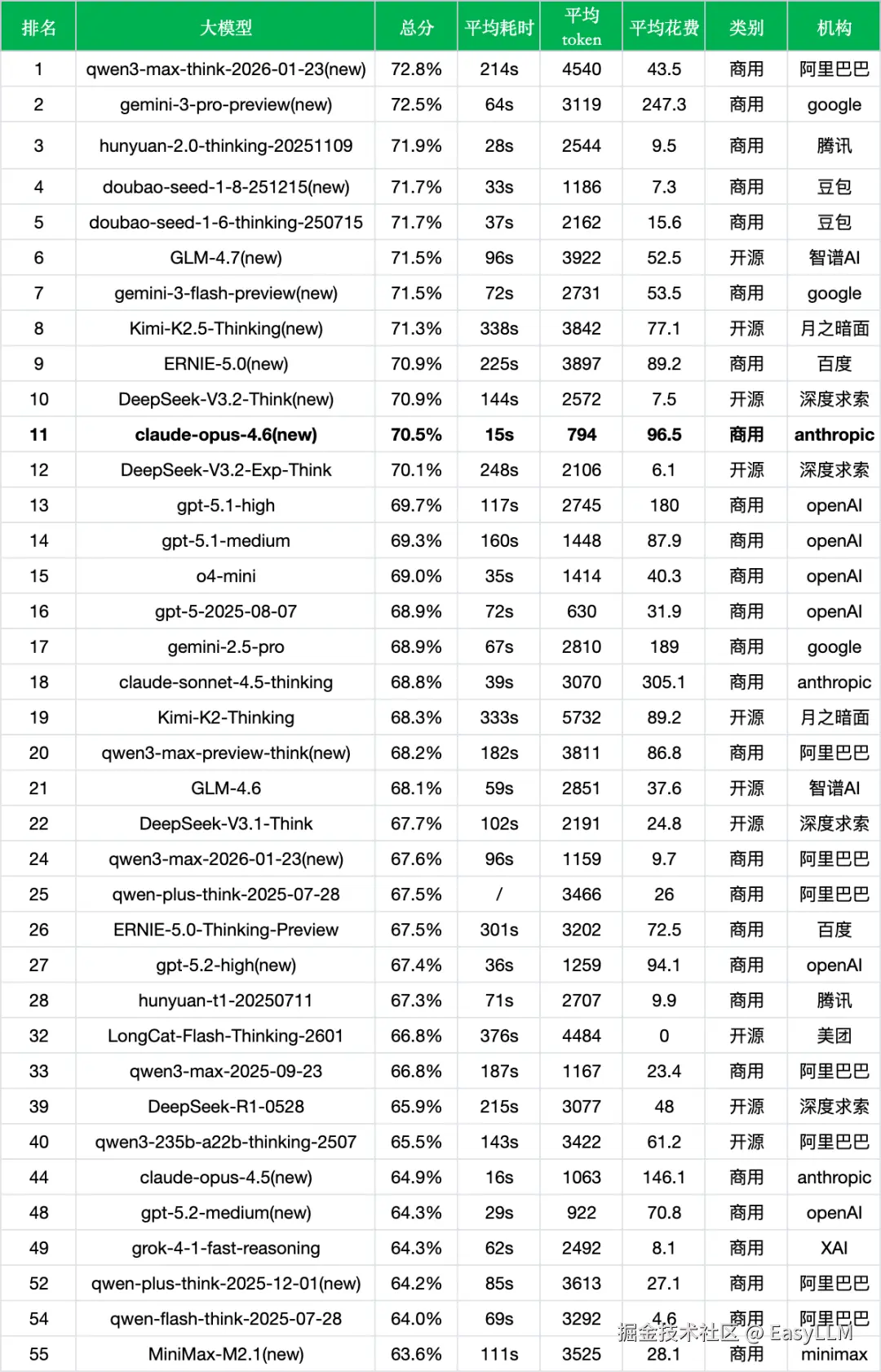 - Claude Opus 4.6的效率优势:相比同档准确率的思考模型,Claude Opus 4.6的核心优势在于响应速度(15s)和token效率(794),远优于DeepSeek-V3.2-Think(144s、2572 token)、Kimi-K2.5-Thinking(338s、3842 token)等,适合对延迟敏感的生产环境。