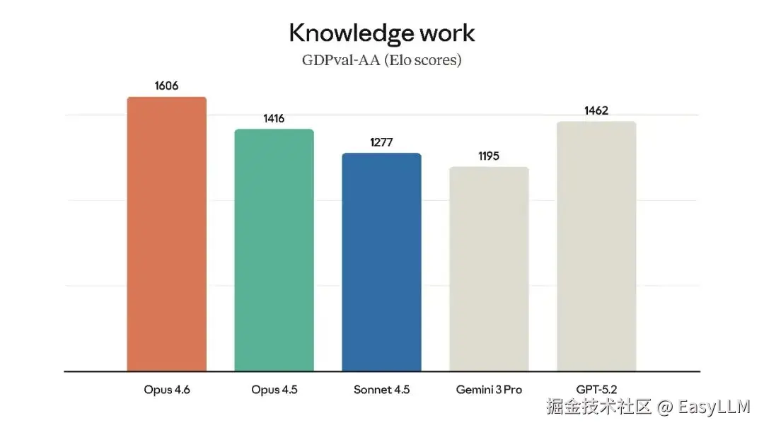 在GDPval-AA评测(由Artificial Analysis独立运行,评估金融、法律等领域的高价值知识工作任务)中,Opus 4.6超越了业界第二名OpenAI的GPT-5.2约144 Elo分,超越其前代产品Claude Opus 4.5达190 Elo分。官方表示,这意味着Claude Opus 4.6在该评测中击败GPT-5.2的概率约为70%。