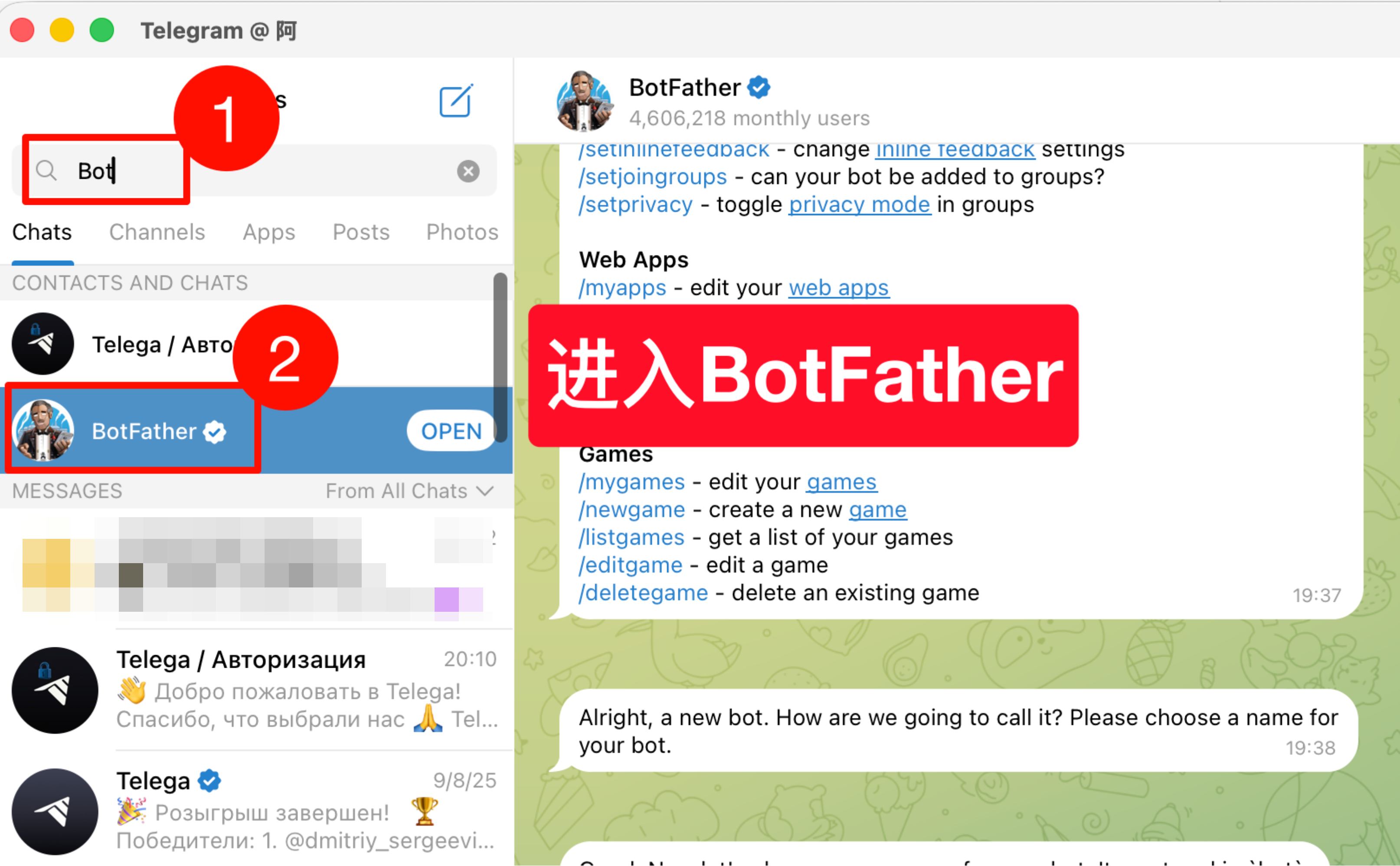 创建 Bot 并获取 Token 在 Telegram 中搜索