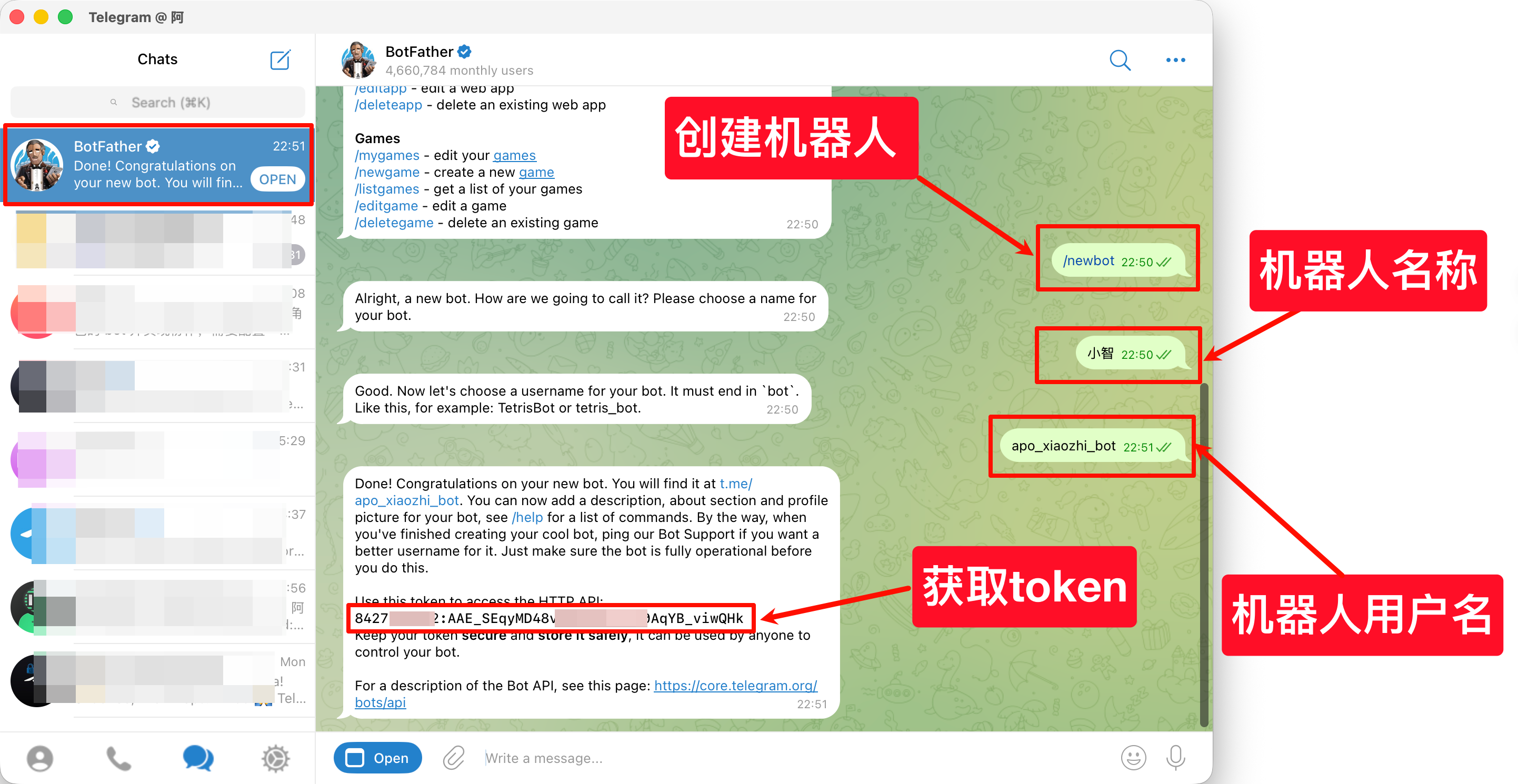 /newbot,按提示设置机器人名称和用户名,完成后会收到一个 API Token,请务必保存好,后面配置时需要用到。