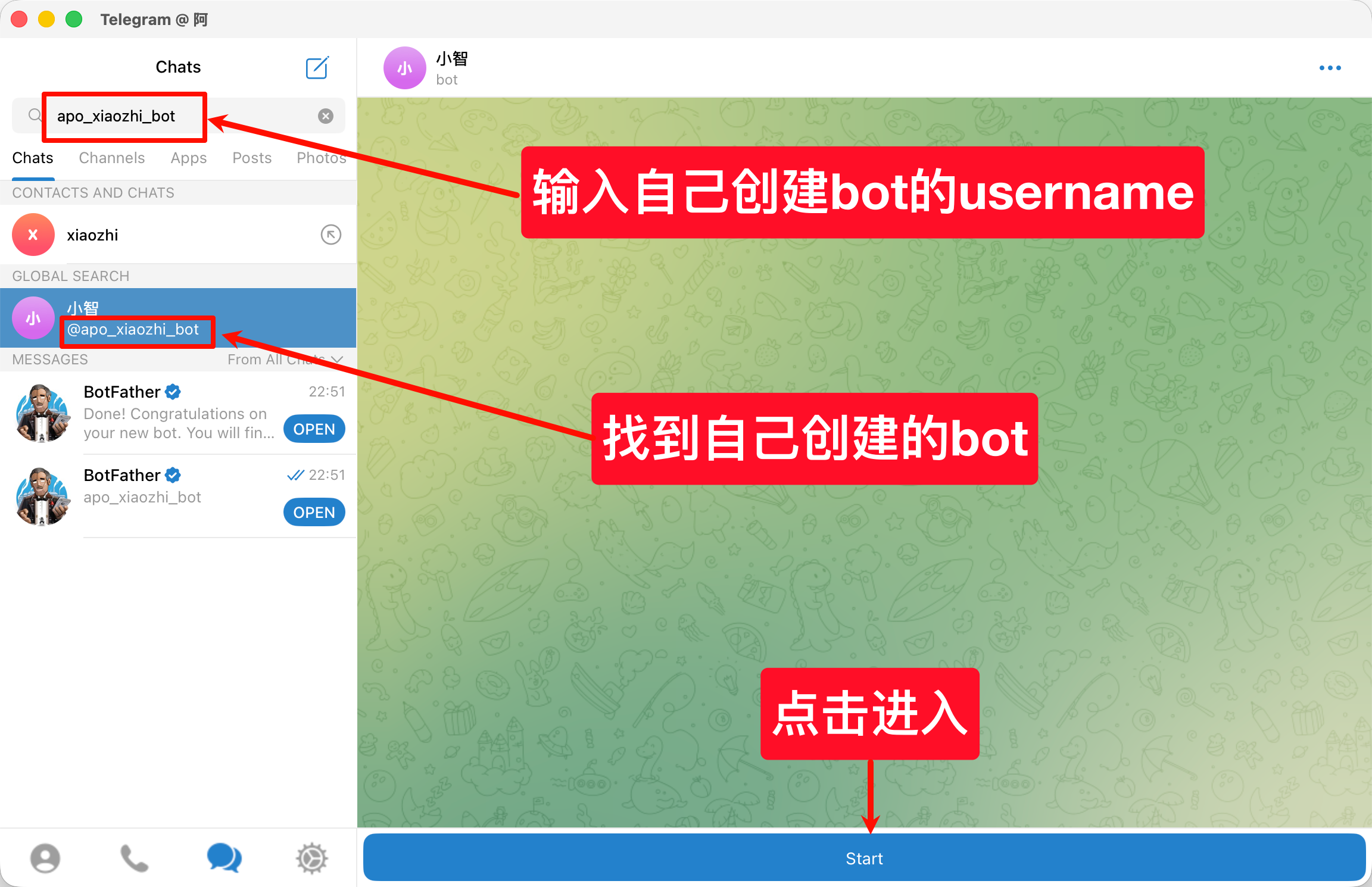 获取配对码 搜索你刚创建的 Bot 用户名,进入聊天界面,点击 Start。