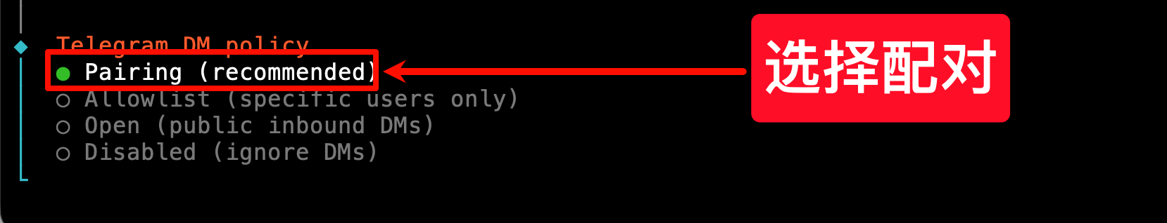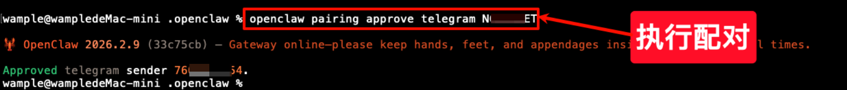 openclaw与你的 Bot 绑定:openclaw pairing approve telegram 你的配对码看到成功提示即表示配对完成。