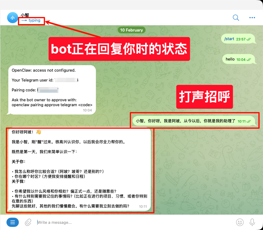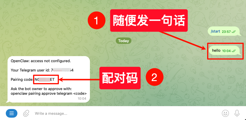 随便发送一条消息,Bot 会自动回复一个配对码(Pairing Code),请复制保存,后面配对环节会用到。