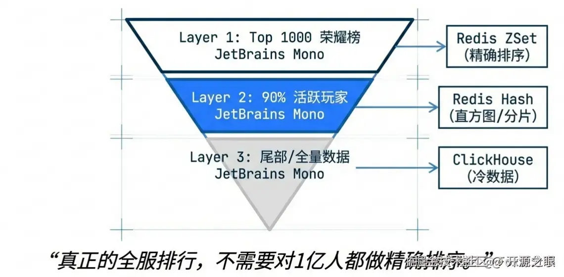 要解决 1 亿人的排名,核心心法只有一条: “抓大放小,甚至不准” 。真正的全服排行,其实不需要对 1 亿人都做 ZSet 排序。我们把玩家分成三层漏斗: