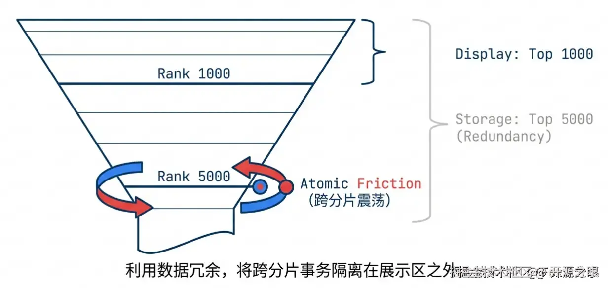 策略: “数据冗余” 。ZSet 实际存储 Top 5000,对外只展示 Top 1000。这样“边界摩擦”发生在第 5000 名,对前 1000 名的展示没有任何影响,实现了软隔离。