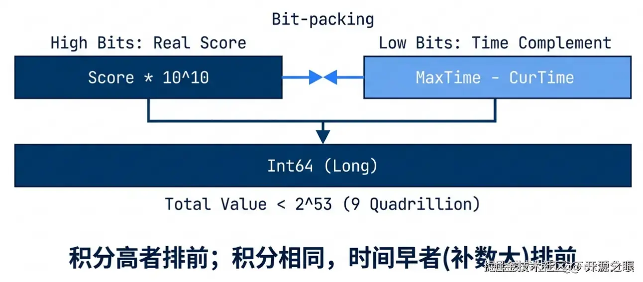 - 同分策略:放弃小数时间戳(有精度丢失风险),采用 ‘高位分数 + 低位时间互补’ 的整型拼接策略,确保先到先得,且数值控制在 以内。