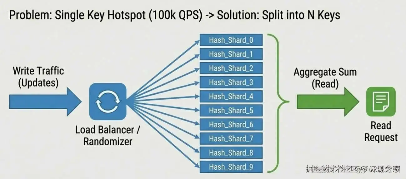 优化: Sharding(分片) 。必须将 Hash 拆分成 N 个 Key(如 Rank_Counter_1 ~ Rank_Counter_10)。写入时随机分片,读取时聚合所有分片的数据。这就把单点压力分散到了集群。