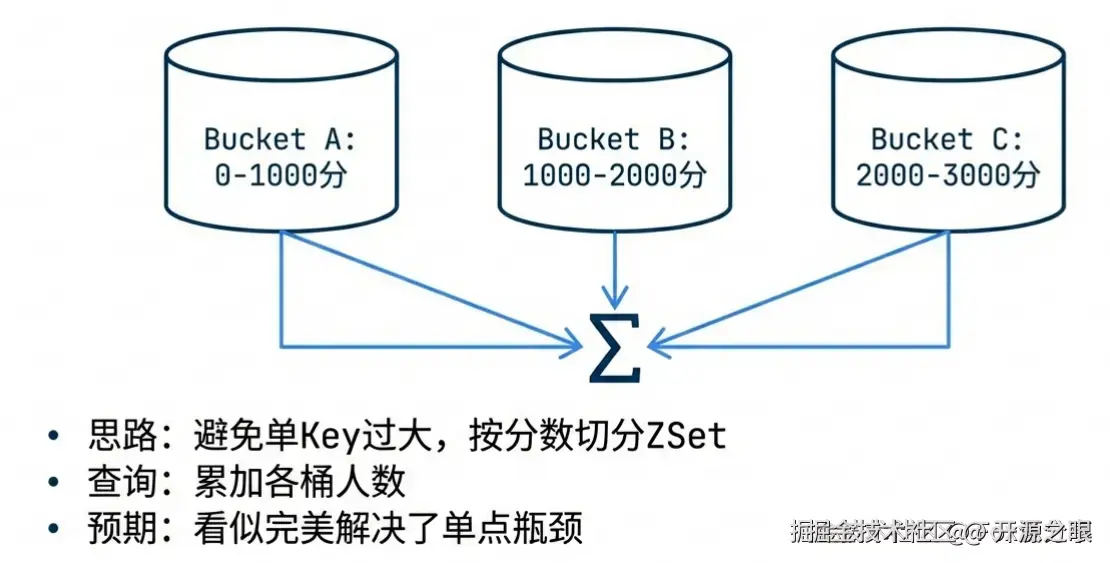 他显然是有备而来,自信满满地甩出了 “Redis ZSet 分段桶排序” 的方案:把玩家按分数每 1000 分切一个 ZSet,避免 BigKey,查排名时累加各桶人数。