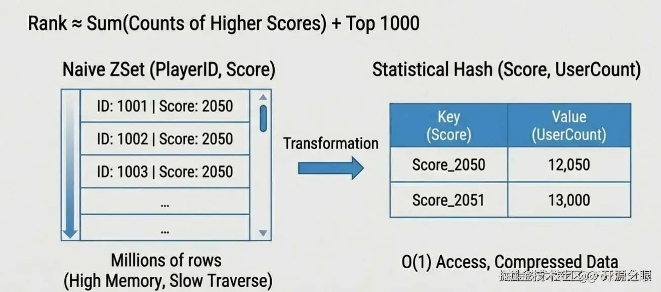 (PlayerID, Score)的 ZSet,而是把分数切得更细(比如 1 分一个槽),只存 “这个分数有多少人” 。