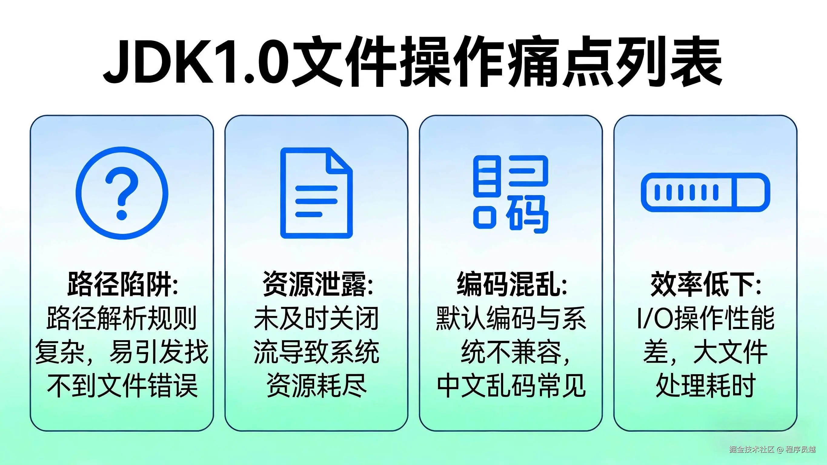 JDK 1.0(基础IO):核心API(File、InputStream、OutputStream、BufferedInputStream),实现“能操作文件”的基础目标,留下路径适配、资源泄露、编码混乱、效率低下4个核心痛点;