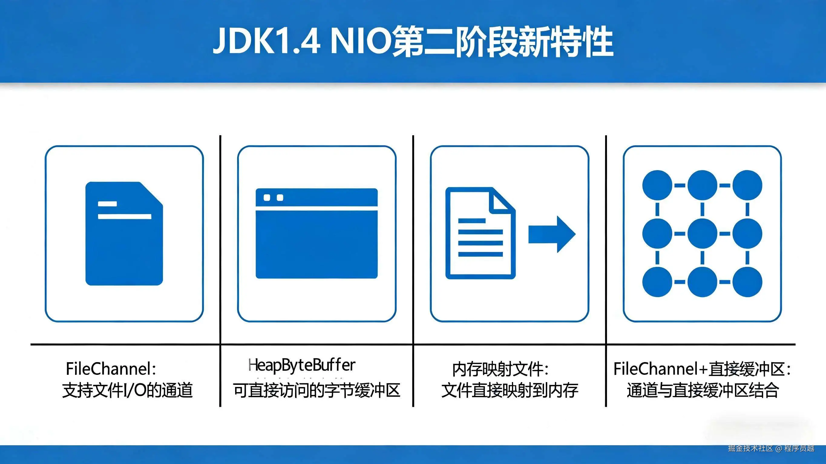 针对基础IO留下的四个核心痛点,JDK 1.4推出了Java NIO(java.nio包),核心新增**FileChannel、ByteBuffer、文件内存映射(MappedByteBuffer)**三大组件,重点解决了路径适配、编码混乱和效率低下三大问题,同时大幅优化了操作便捷性,但并未解决资源泄露问题,且缺乏一站式便捷工具。