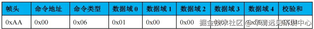 校验机制:校验和=(帧头 + 命令地址 + 命令类型 + 数据域 0 + 数据域 1 + 数据域 2 + 数据域 3 + 数据域 4)& 0xFF,确保数据传输正确性(如查询帧校验和计算:0xAA+0x00+0x06+0x00+0x00+0x00+0x00+0x00=0xB1,校验和为 0xB1)。