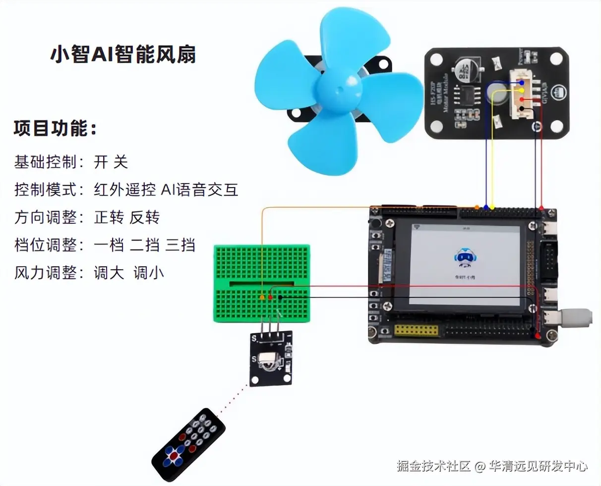 《小智AI智能风扇项目》硬件平台包括华清远见STM32F103&ESP32-S3 AIoT开发板、DAP/STLINK-V2仿真器、2.8寸屏、风扇模块、红外接收模块与遥控器。