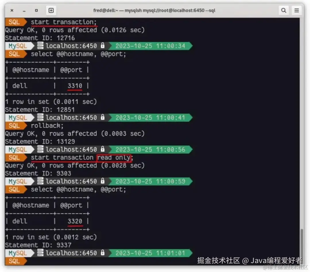我们可以看到,默认情况下,如果执行读操作,我们将访问到副本,但如果启动事务,我们将到达复制源(主),而无需更改端口并使用相同的连接。