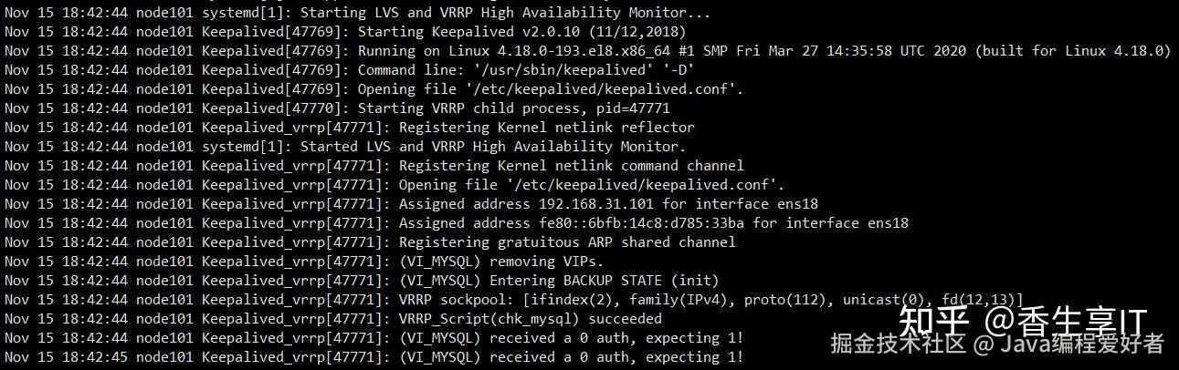 Nov 15 19:09:53 node102 Keepalived_vrrp[13558]: (VI_MYSQL) Sending/queueing gratuitous ARPs on ens18 for 192.168.31.100