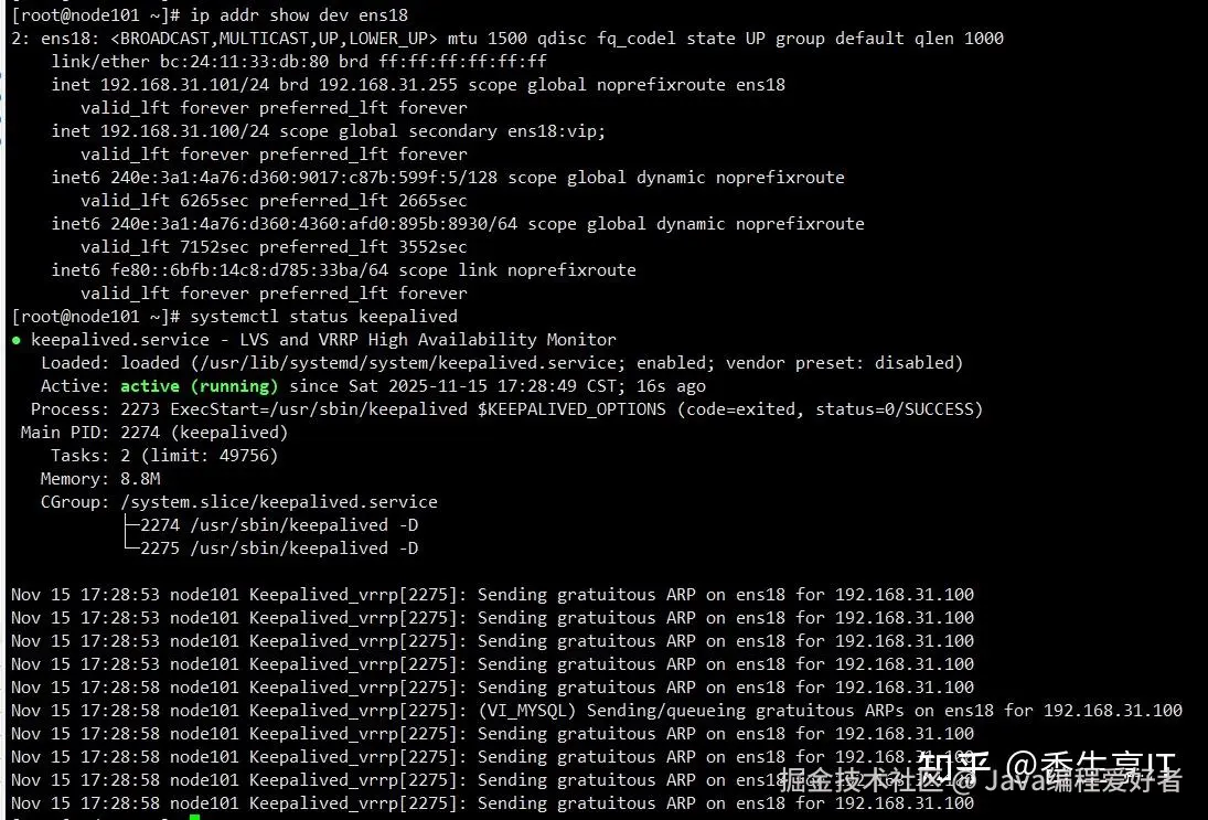 Nov 15 19:09:58 node102 Keepalived_vrrp[13558]: (VI_MYSQL) Sending/queueing gratuitous ARPs on ens18 for 192.168.31.100