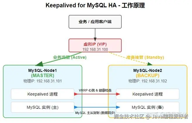 查了半天,根源找到了:只做了数据层的高可用(主从复制),却忽略了服务层的高可用(VIP自动漂移) 。高可用是个“木桶”,最短的那块板决定你的睡眠质量。你的数据同步得再快,应用访问不到也是白搭。