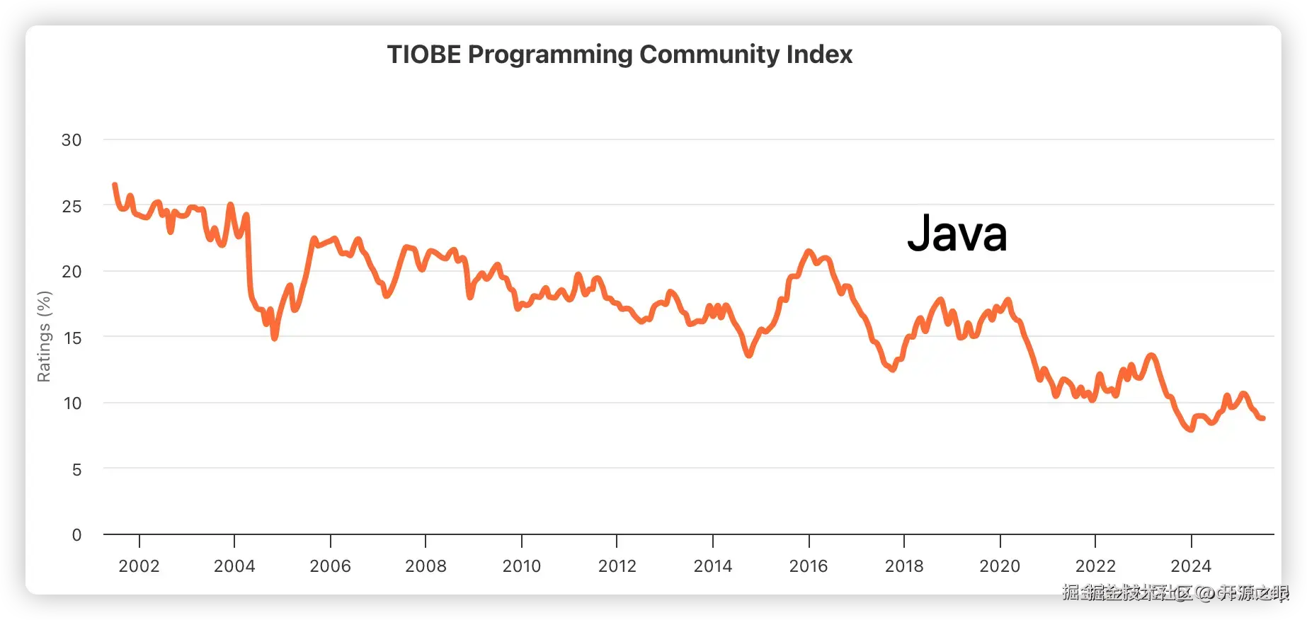 拉了一下最近这二十多年来 Java 的 TIOBE 社区指数变化趋势看了看,情况似乎不容客观。