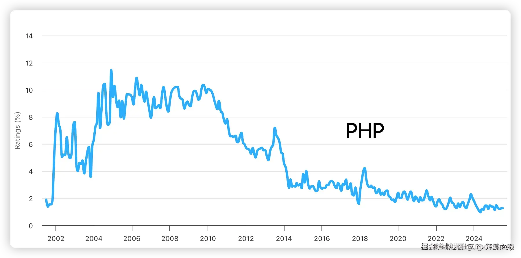 昨晚在家整理浏览器收藏夹时,才想起了 TIOBE 社区,于是打开看了一眼最近的 TIOBE 编程语言社区指数。