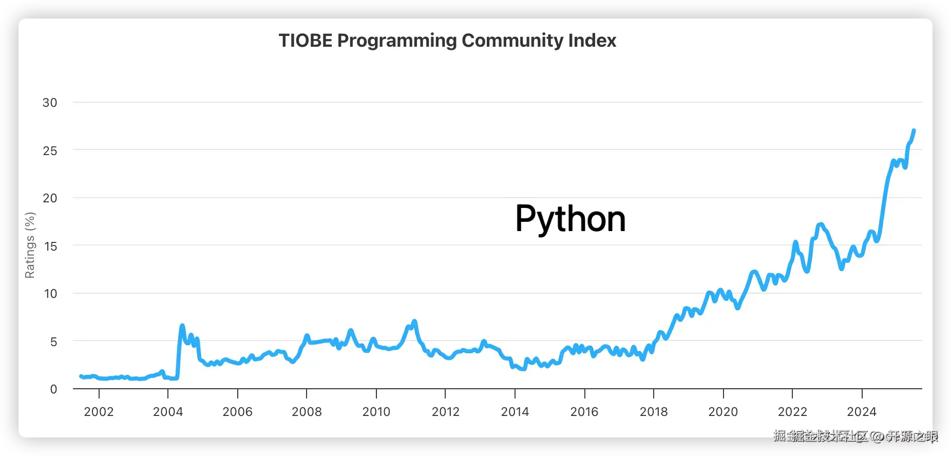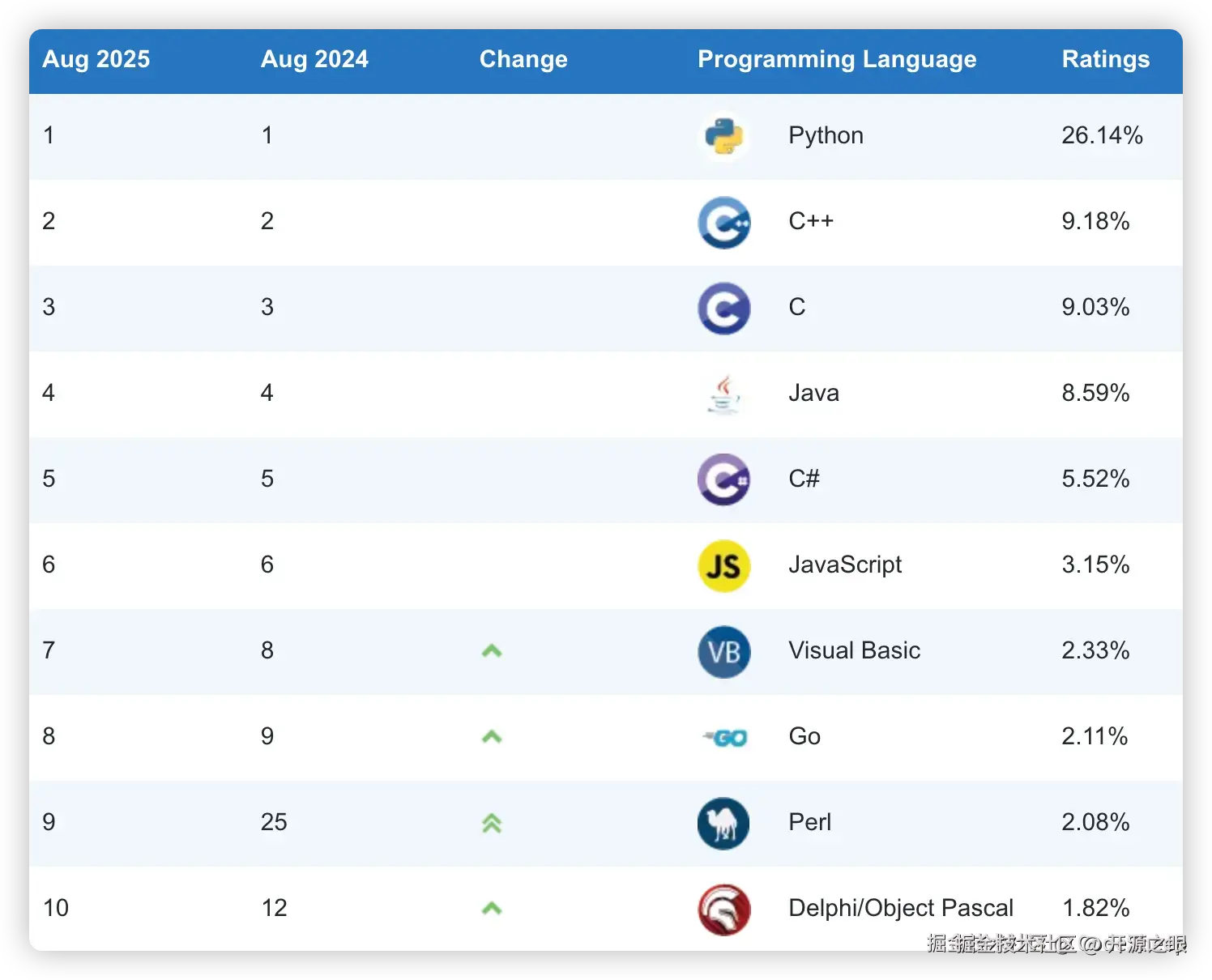 TIOBE 编程社区相信大家都听过,这是一个查看各种编程语言流行程度和趋势的社区,每个月都有榜单更新,每年也会有年度榜单和总结出炉。