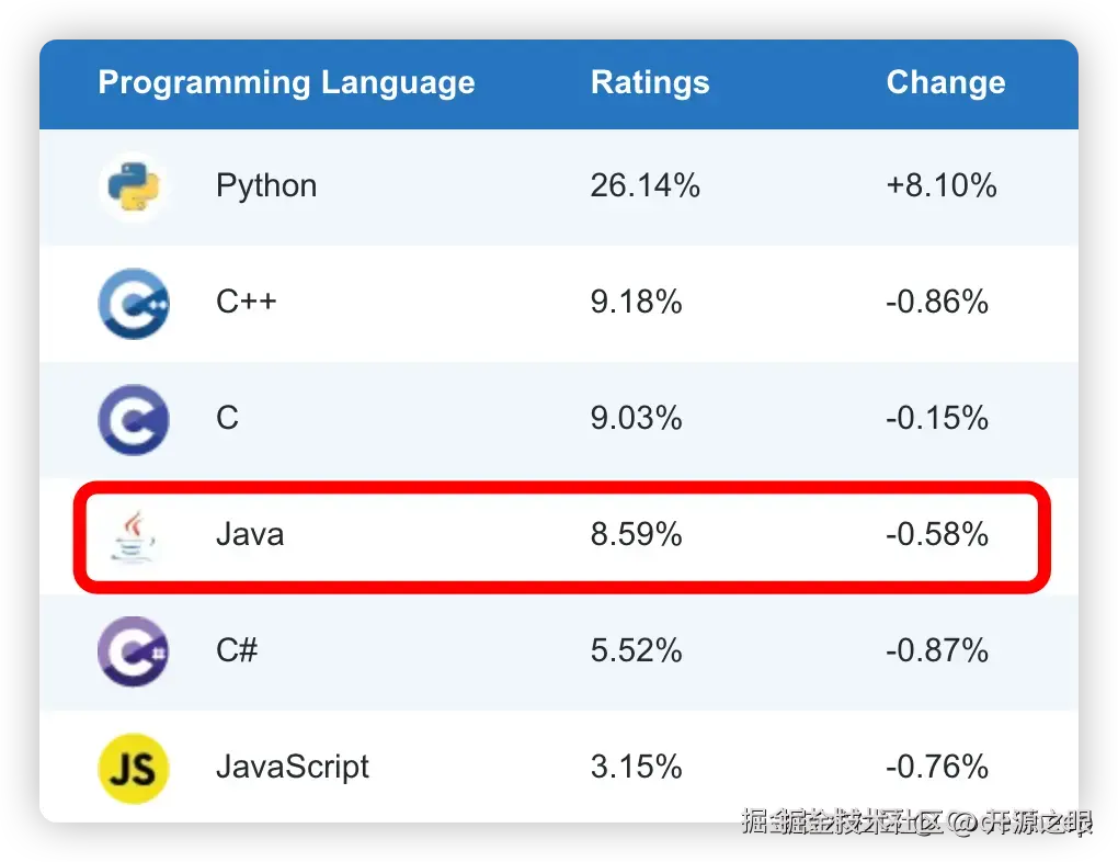 然而这才过去几年,如今的 Java 似乎也没有了当年那种无与争锋的强劲势头,由此可见 AI 领域的持续进化和繁荣对它的冲击到底有多大。