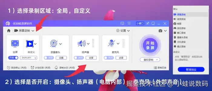 优加蛙录屏软件支持Windows 7/10/11和macOS系统,覆盖主流电脑平台。这款电脑屏幕录像软件提供全屏、区域、窗口、游戏、音频和摄像头画中画等录制方式,操作灵活。