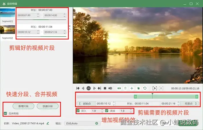 3.多项内容优化工具: 录制过程中软件会自动对内容进行降噪和画质优化,录制完成后,用户还能通过软件内置工具对视频进行分段等剪辑操作。