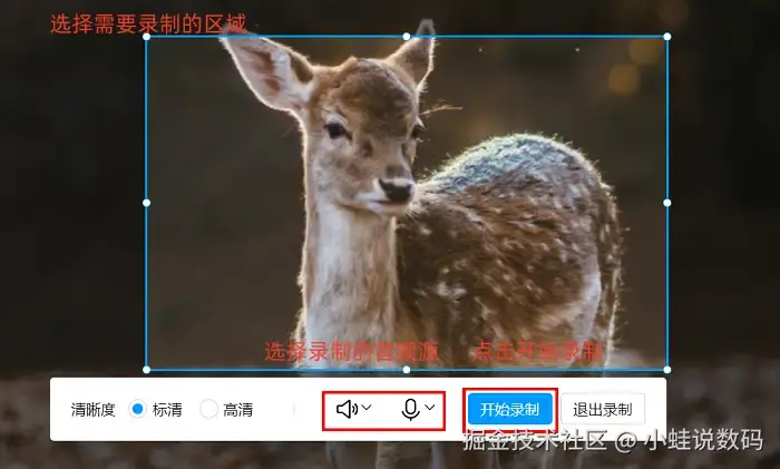 进入录屏准备阶段,可按需设置录屏区域范围与音频来源,电脑屏幕录像参数调节到位后,点击 【开始录制】 启动操作;