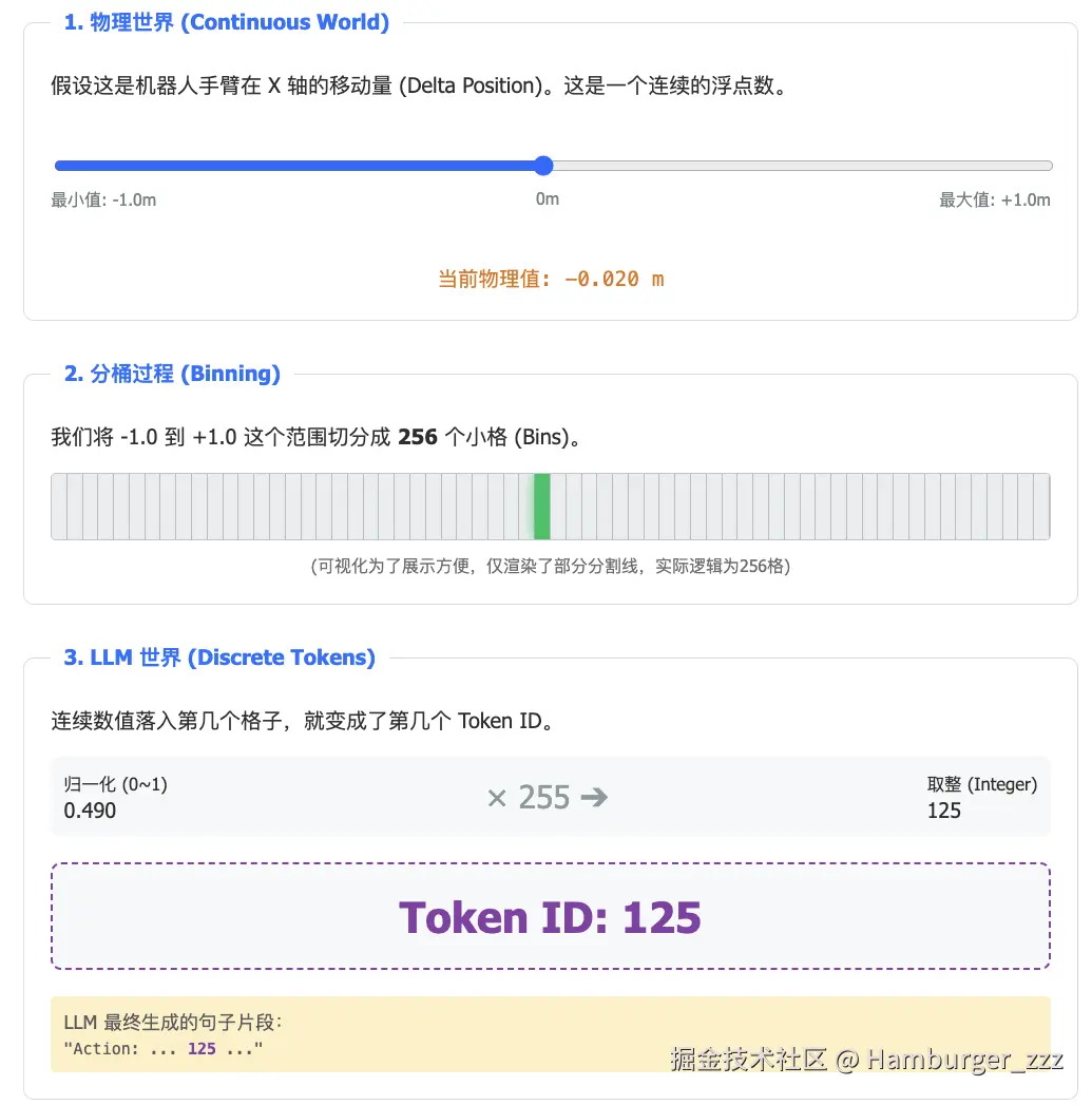 背景:物理世界中的数值、动作是连续的,如机械手臂的移动,可能是1.0m,也可能是1.11111111m,这对LLM习惯的离散化token来说是一个灾难,因为不可能穷举所有可能的数值然后用token id进行表示。