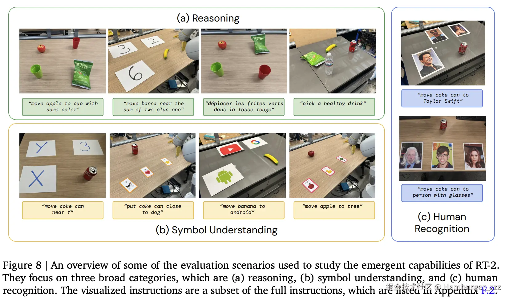 涌现的定义: 当用户给出一个从未在机器人数据中出现过的复杂指令时,RT-2 能够利用 Web 知识将图像中的物体与指令对应起来,并调用机器人学到的动作去执行