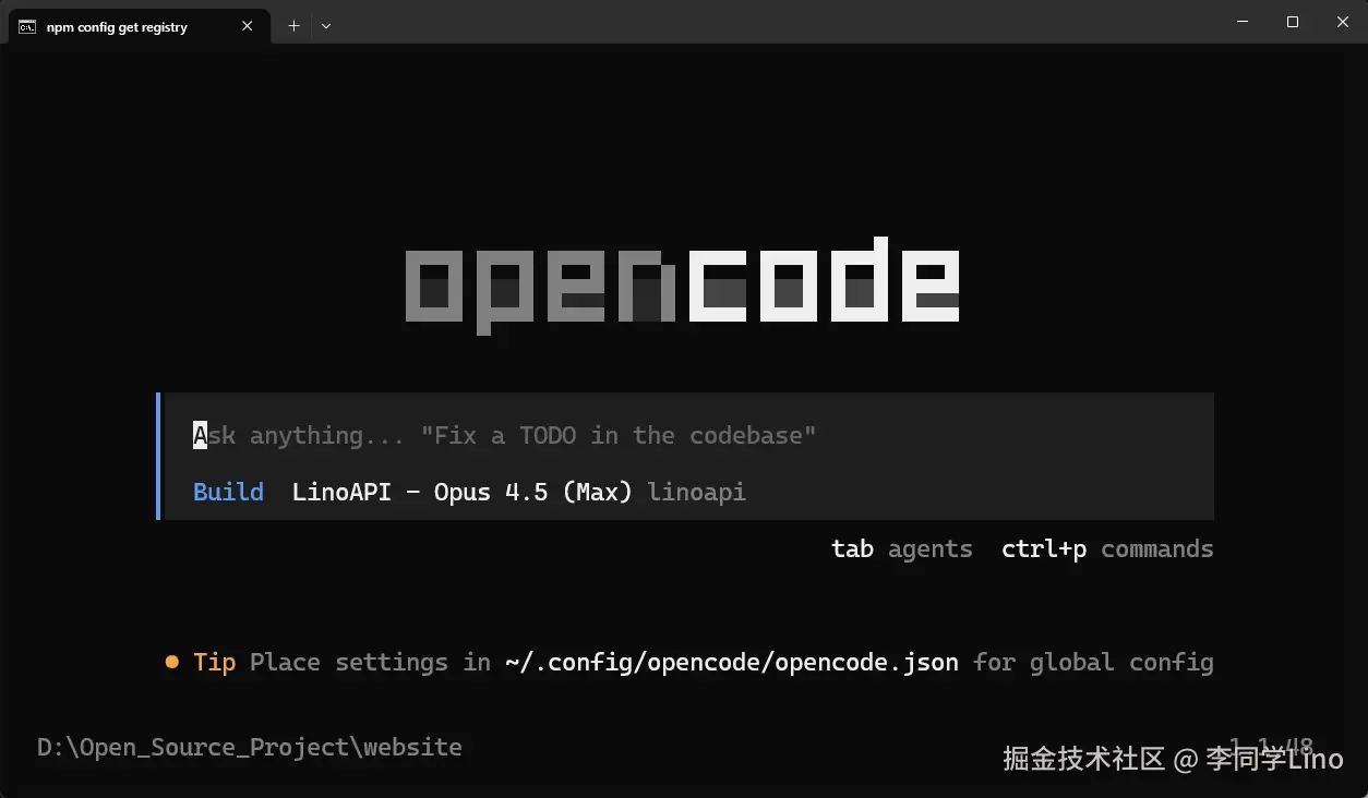 启动后,你会看到 OpenCode 的欢迎界面。默认模型可能不是最强的,我们需要手动切换到 LinoAPI 的通道。 在光标闪烁处输入斜杠命令,输入后需要回车键: