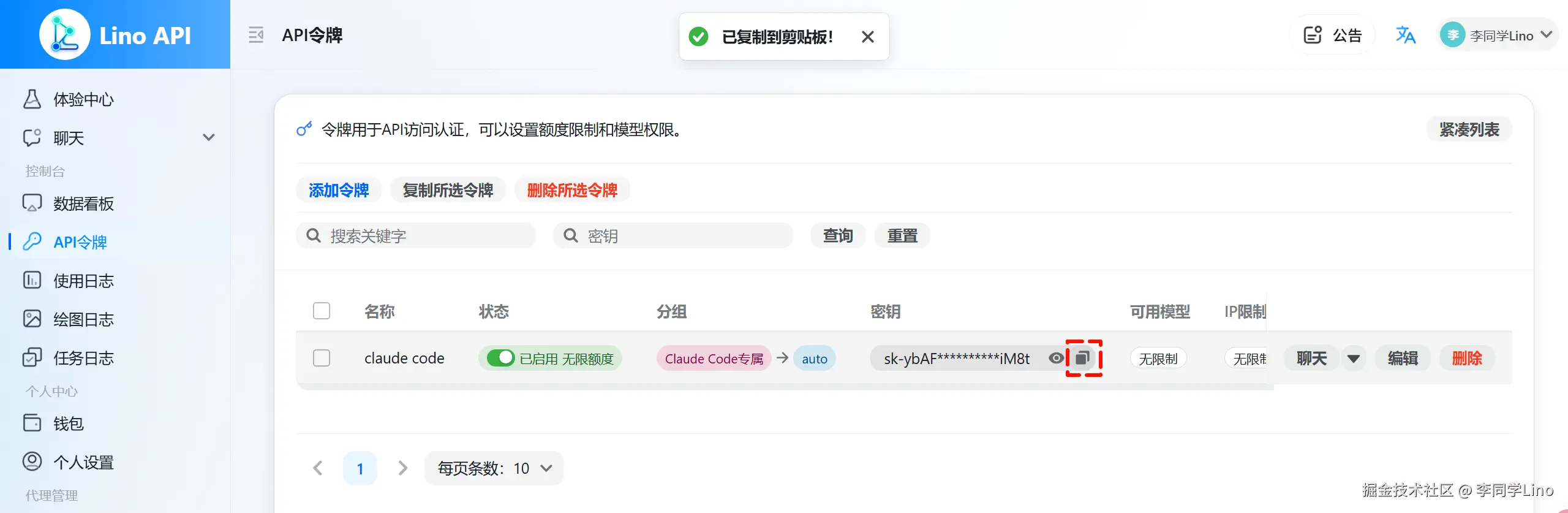 由于官方的 Anthropic 账号注册门槛极高(需要海外信用卡、容易封号),且不支持国内直连。这里我们统一使用 LinoAPI 提供的开发者专用令牌。