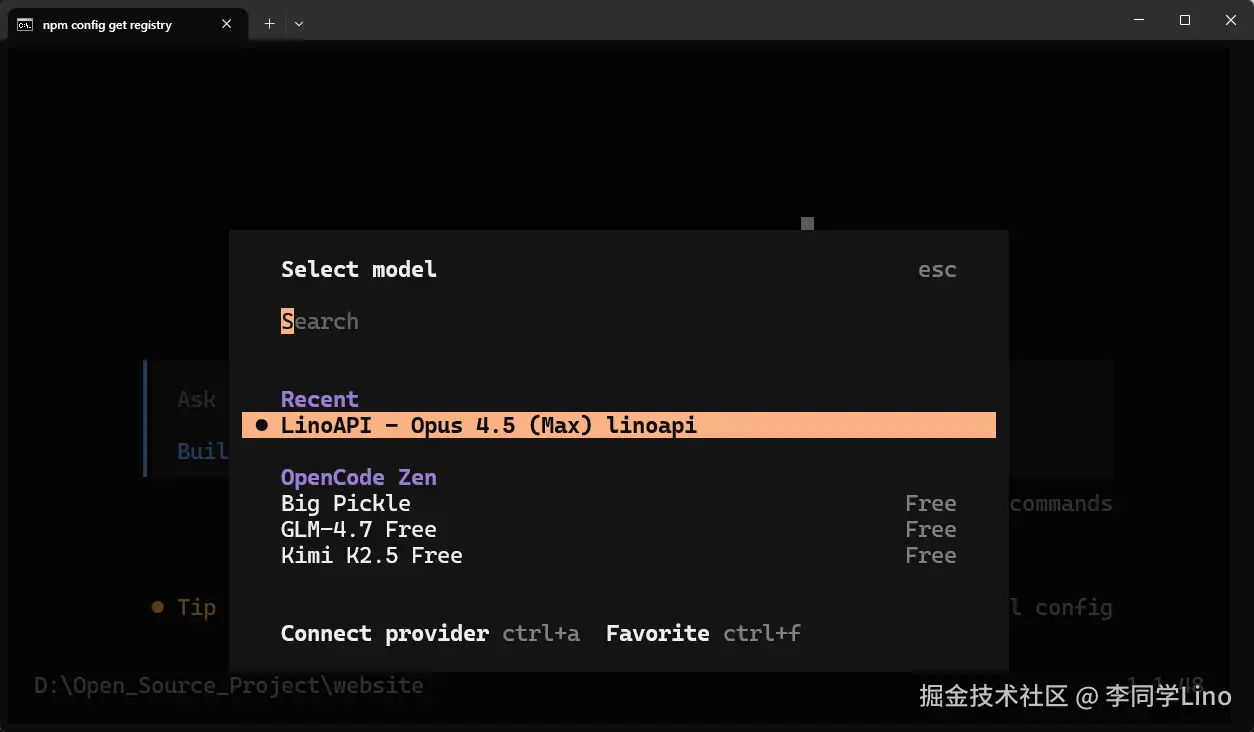 此时会出现一个交互式选择列表,请使用键盘 上下键 (↑ ↓) 移动高亮条,找到我们刚才配置的: 👉 LinoAPI - Opus 4.5 (Max),按回车键确认选择。