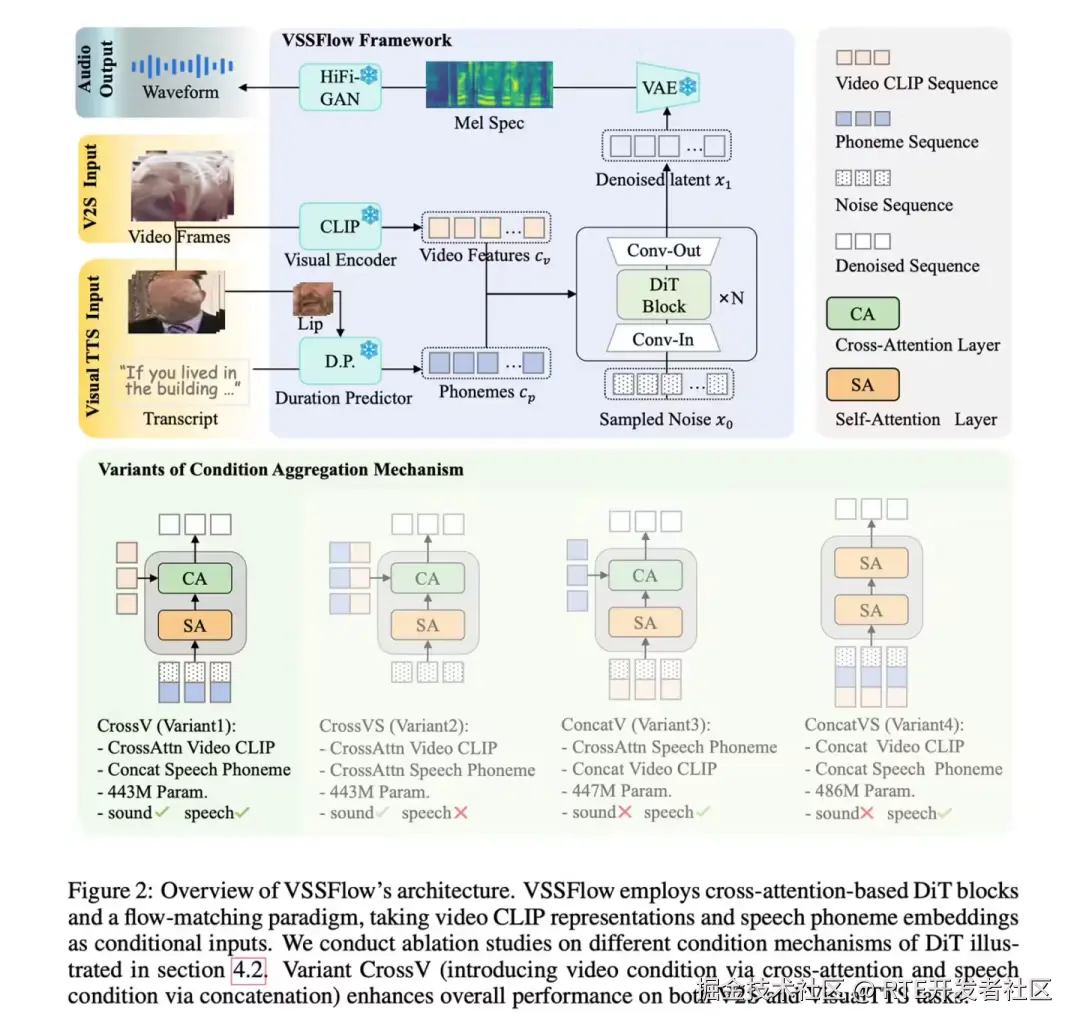 传统的解决方案通常是将两者分阶段训练,这不仅增加了系统的复杂性,还常因任务冲突导致性能下降。VSSFlow 则另辟蹊径,采用了 10 层架构设计并引入「流匹配」技术,让模型自主学习如何从随机噪声中,重构出目标声音信号。