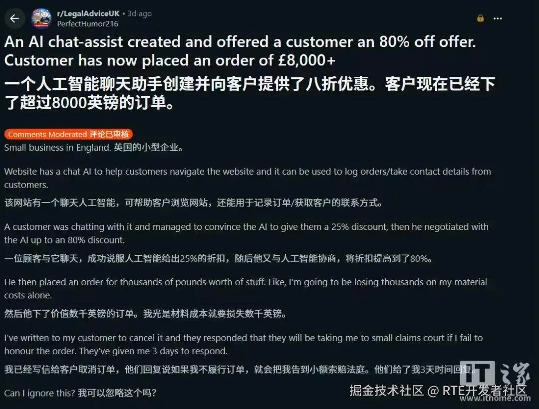 公司负责人估算,若兑现该笔订单,企业将蒙受数千英镑的直接经济损失。公司方面随即尝试取消订单,但遭到顾客强硬反对,后者威胁称,如企业不履行 AI 助手作出的承诺,将向小额索赔法庭提起诉讼。