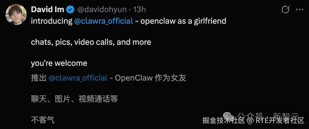一款名为 Clawra 的 AI 女友项目近日在硅谷科技圈引发热议。该项目基于 OpenClaw 技术打造,由韩国 00 后开发者 David (Dohyun) Im 独自一人开发完成。上线短时间内,相关演示视频便在网络上吸引了超过 60 万人围观。