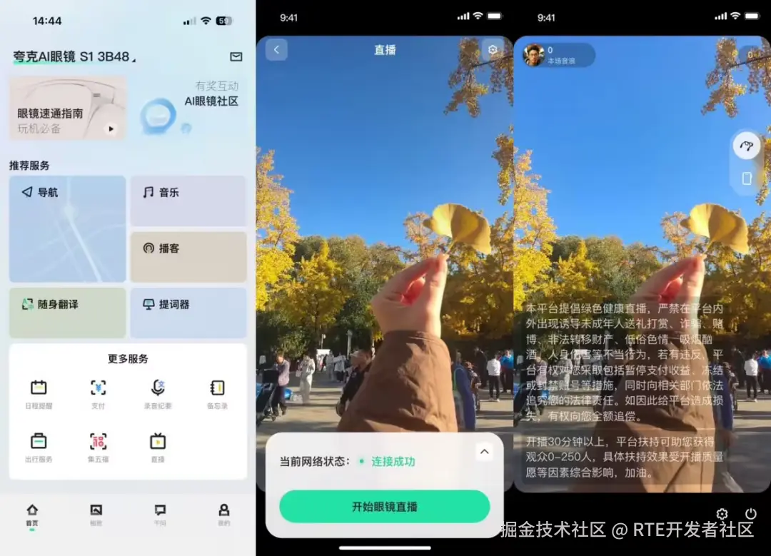 S1 眼镜现已支持「所播即所见」的第一视角直播功能。完成系统升级后,用户只需打开「夸克 AI 眼镜」App,点击首页下方的「直播」按钮,即可通过眼镜内置的第一视角摄像头直接发起直播。