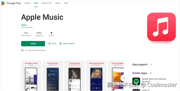 步骤 1:在您的Android设备上前往 Google Play 商店并搜索Apple Music 。下载并安装官方应用程序。