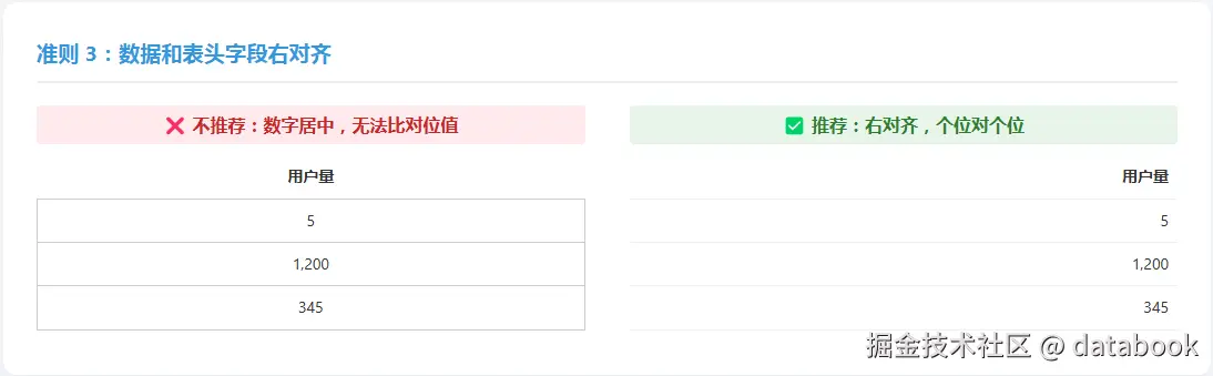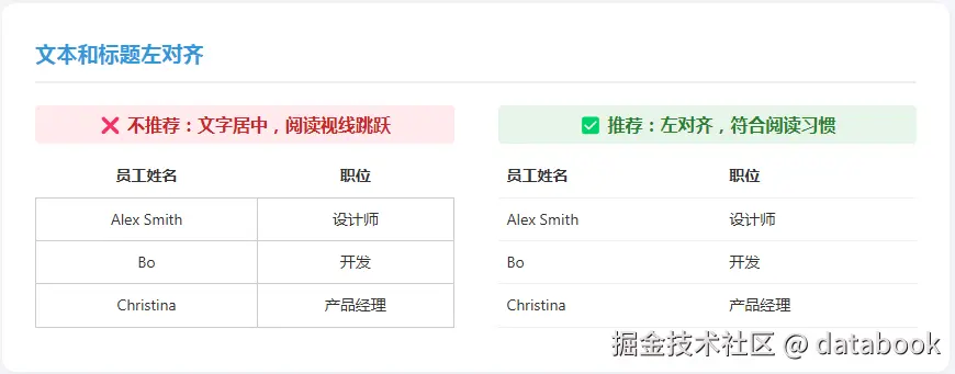 对于非数字的文本(如名字、地区、类别),左对齐符合我们的阅读习惯(从左到右)。