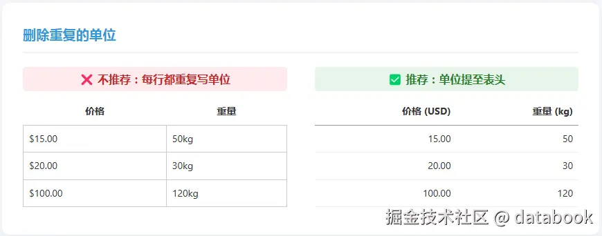不要让读者的眼睛一遍遍重复读同样的信息。把单位($、kg、%)提到表头里去。