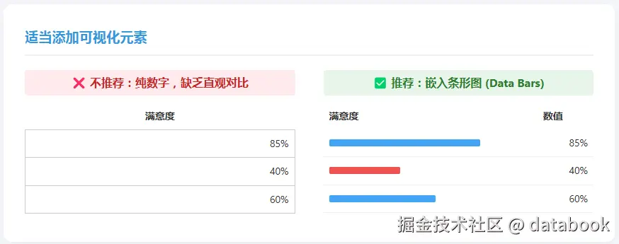在表格里嵌入数据条(Data Bars)、迷你图(Sparklines) 或 热力色块,能让表格瞬间变成“可视化仪表板”。