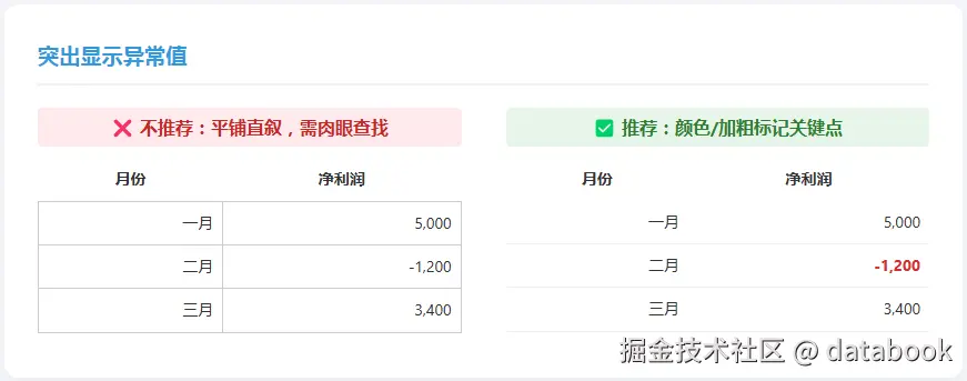 如果某个数据需要关注(如亏损、未达标),请用红色或加粗标出来,不要让读者自己去“找茬”。